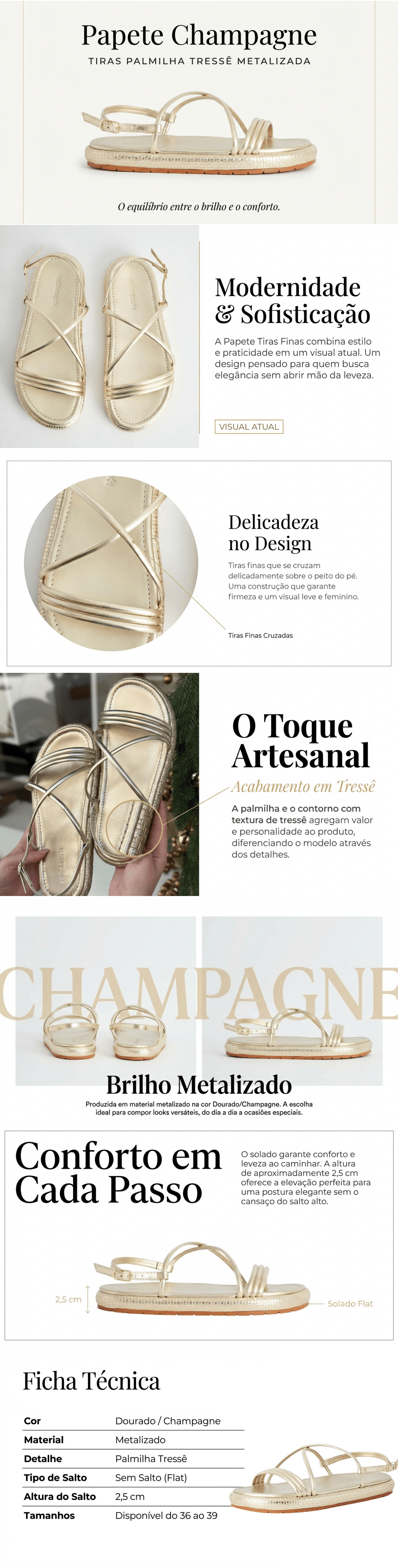 A Papete Tiras Finas Palmilha Tressê combina conforto e estilo em um design moderno e sofisticado. Feita em material metalizado, ela conta com tiras finas que se cruzam delicadamente sobre o peito do pé, criando um visual atual. O solado de aproximadamente 2,5 cm garante o conforto e leveza ao caminhar, e a palmilha com textura de tressê agrega um valor artesanal ao produto. Ideal para compor looks versáteis.