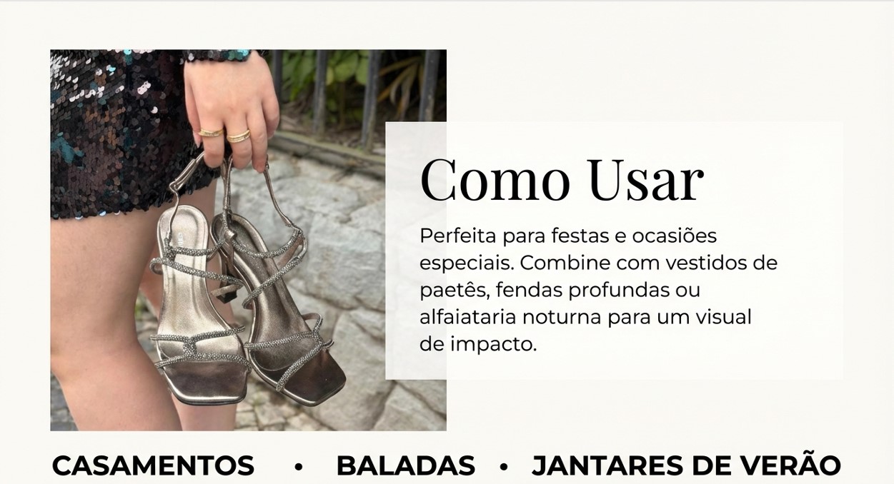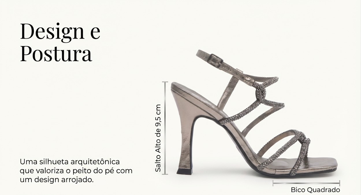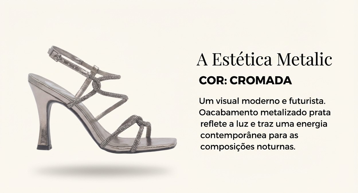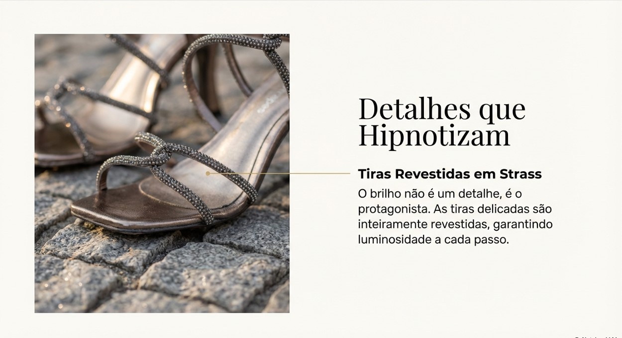Essa Sandalia Salto Alto Festa Elegante Cromado Sonho dos Pés - Lolla, é puro glamour. Feita em material tecnológico metalizado, com tiras revestidas em strass, fechamento em fivela metálica, salto de 9,5cm, ela deixa o pé super sensual e feminino. Perfeita para brilhar nas noites de verão.